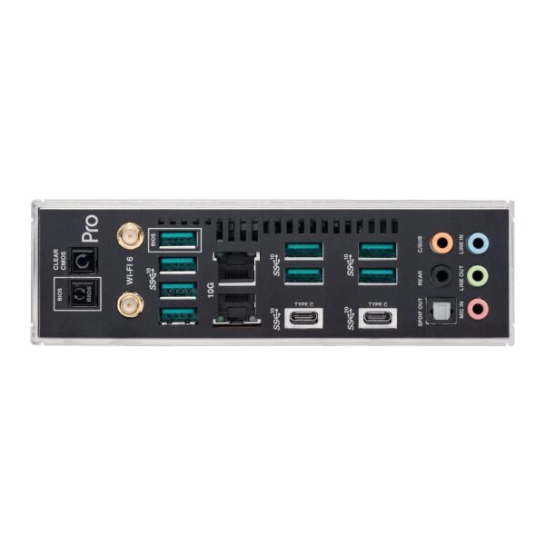 | I/O panel (zadnji) | 1 × USB 3.2 Gen2x2 Type-C, 9 × USB 3.2 Gen2 (8 × Type-A + 1 × Type-C), 2 × 10 Gb LAN-porta, WiFi antene konektori, 5 × audio jack-ova, 1 × Optical S/PDIF out, BIOS FlashBack™ dugme, Clear CMOS dugme |
