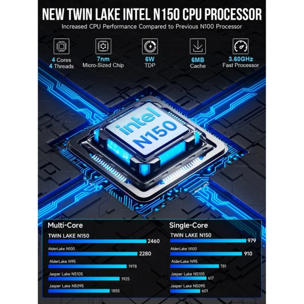 | CPU | Intel Twin Lake N150 (4C/4T, turbo 3,6 GHz, 6 W TDP) |