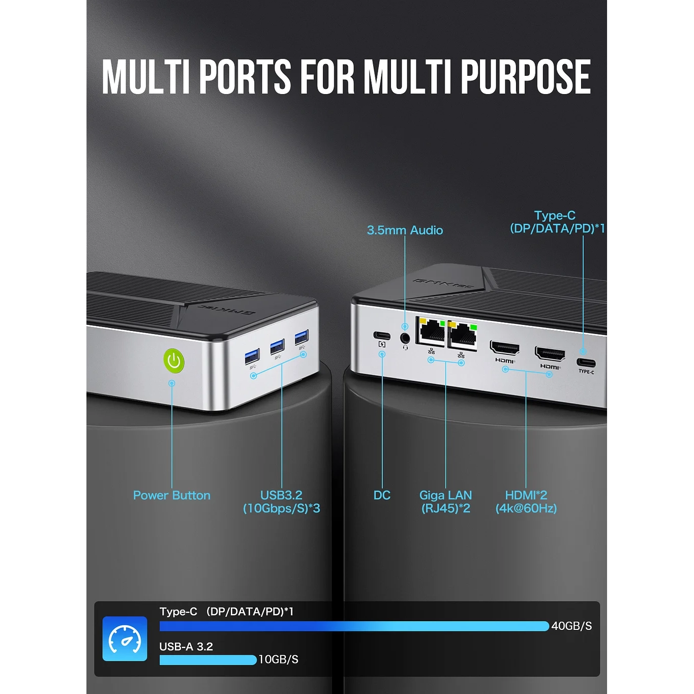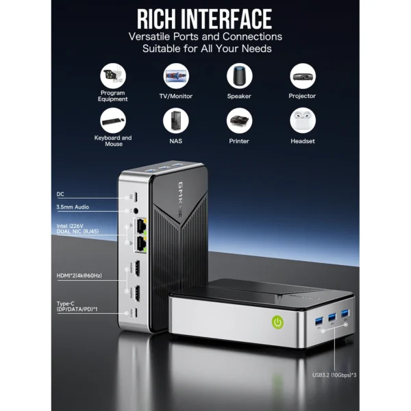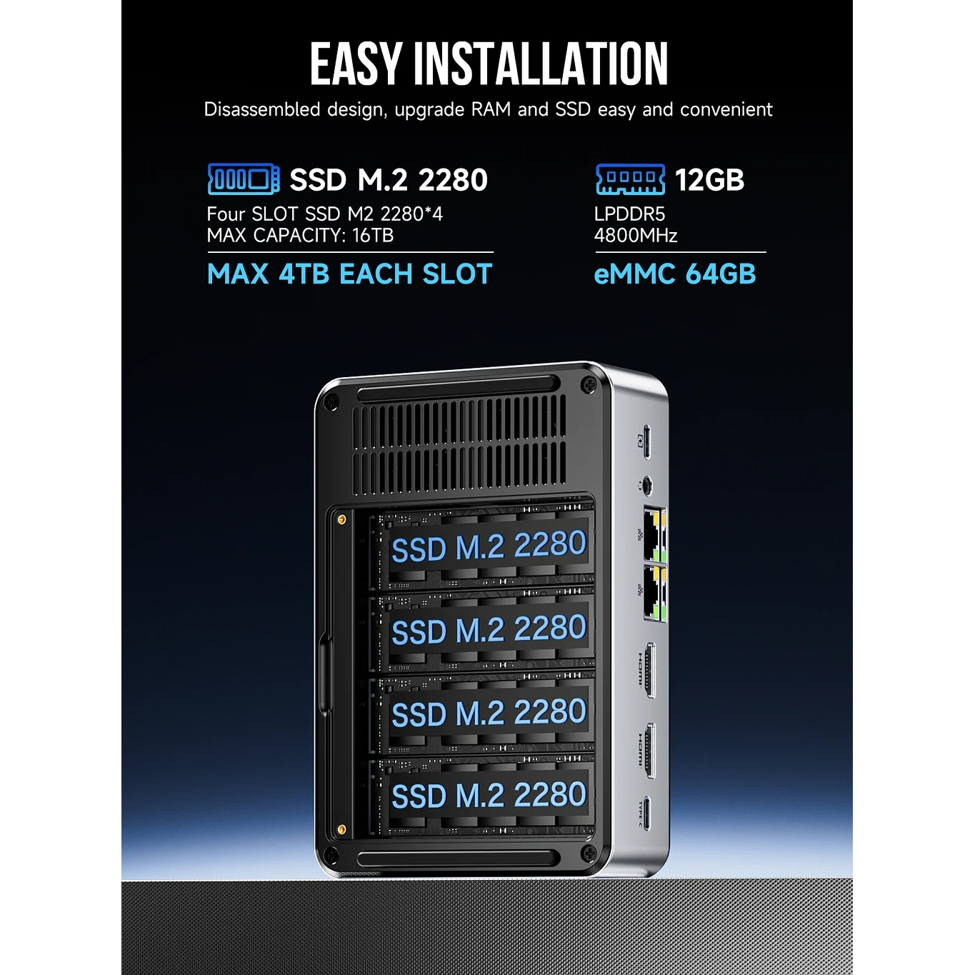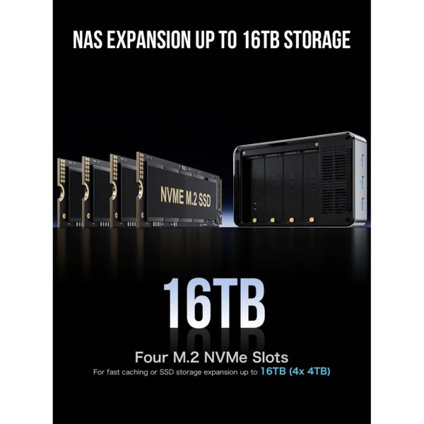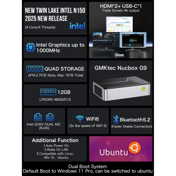 Intel N150 4C4T/12GB DDR5 4800MHz/64GB EMMC+512GB M.2 (16TB Max ,4xM.2 slot),WIFI 6 802.11AX,BT 5.2, 2xRJ45 2.5G INTEL i226,2xHDMI 4K,1xUSBC DP1.4 4K,3xUSB-A 3.2 ,1xUSBC 12V3A,Kensington, VESA Mount
