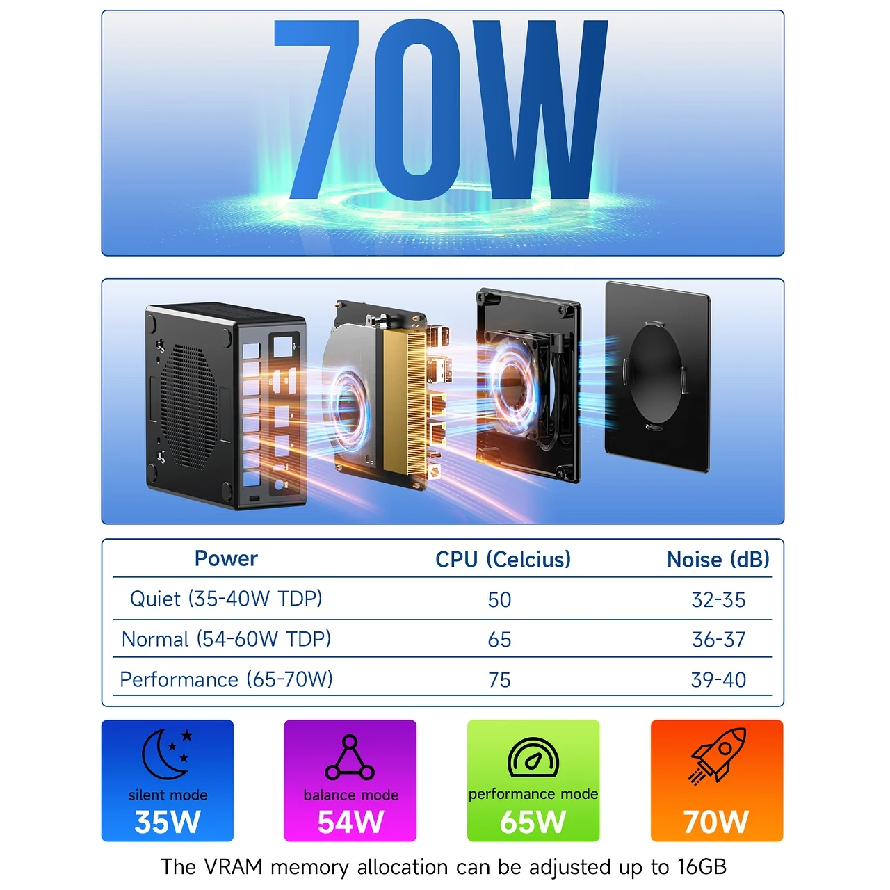 8 jezgra i 16 niti sa turbo brzinom do ~5.1 GHz pružaju performanse desktop klase uz podesivu potrošnju (35–70 W) za balans snage i tišine.
